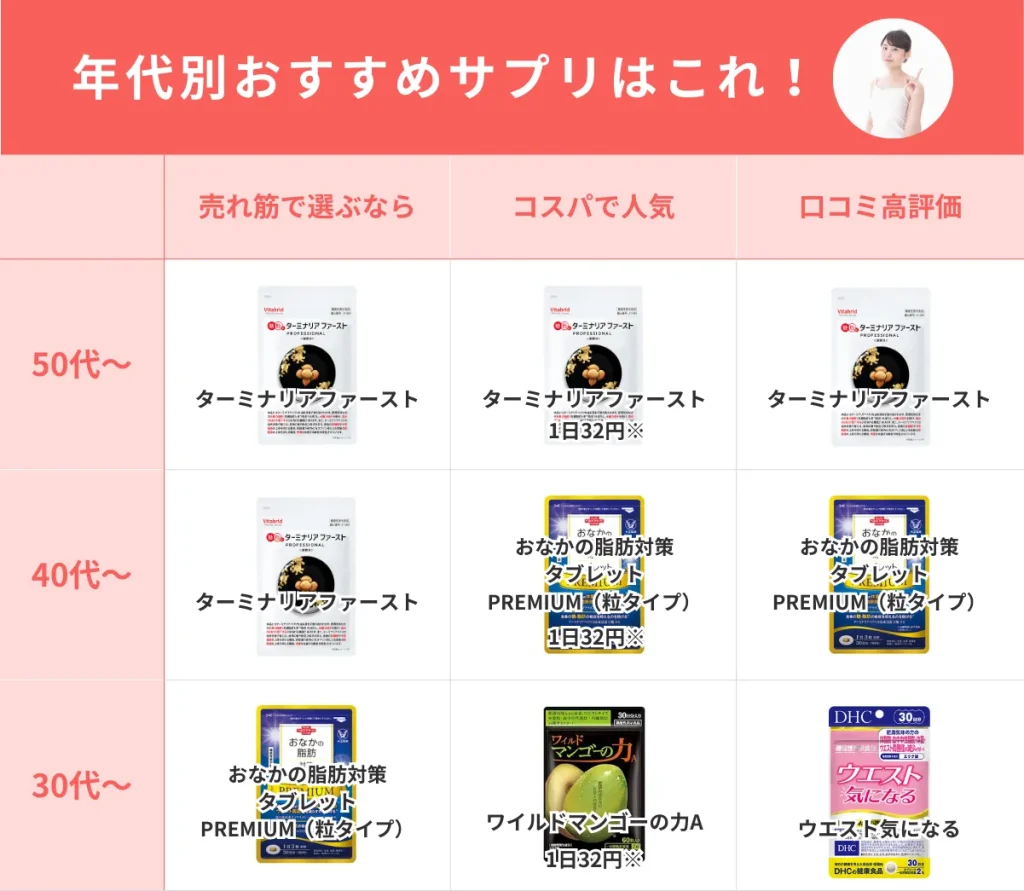 さらに、「年齢別」に選ぶべきダイエットサプリを「売れ筋」「コスパ」「口コミ高評価」に合わせて見ていきましょう。