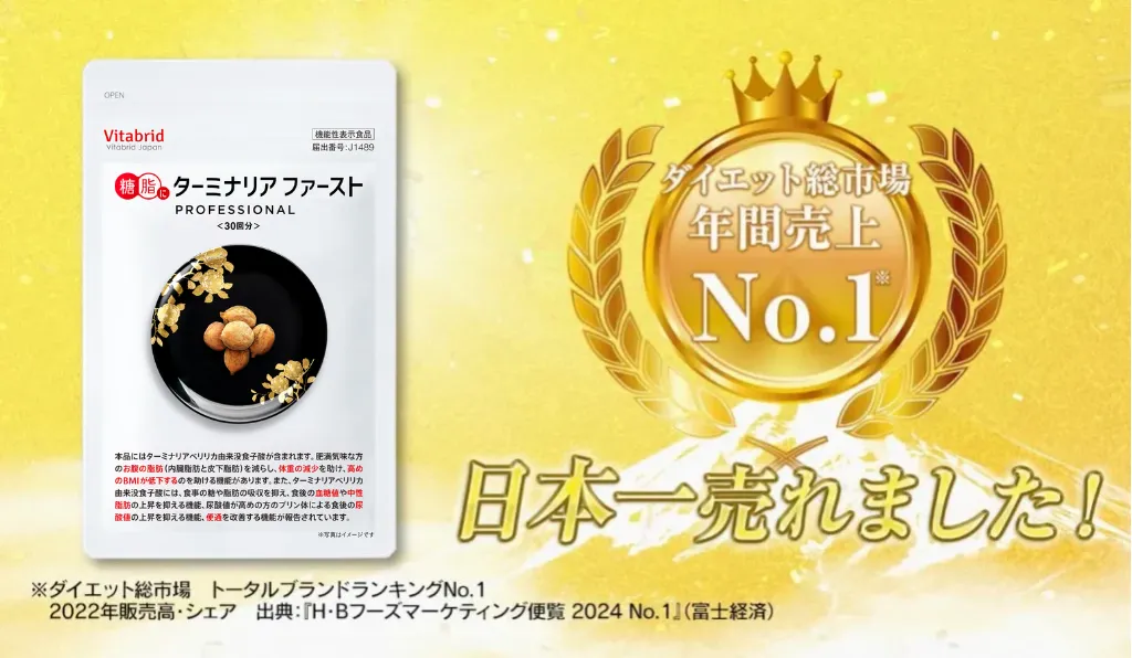 「ターミナリアファースト」は、ダイエットサポート総市場売上NO.1*1を獲得した体重やおなかの脂肪を減らすのを助ける*6脂肪対策サプリです。