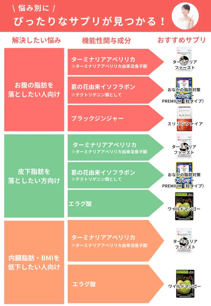 選ばれた5つの優秀なサプリは、配合成分が体重・ウエストサイズ・おなかの脂肪などを減らすのを助ける*1機能を消費者庁に報告している「機能性表示食品」のみを厳選しています。*1)※肥満気味な方の