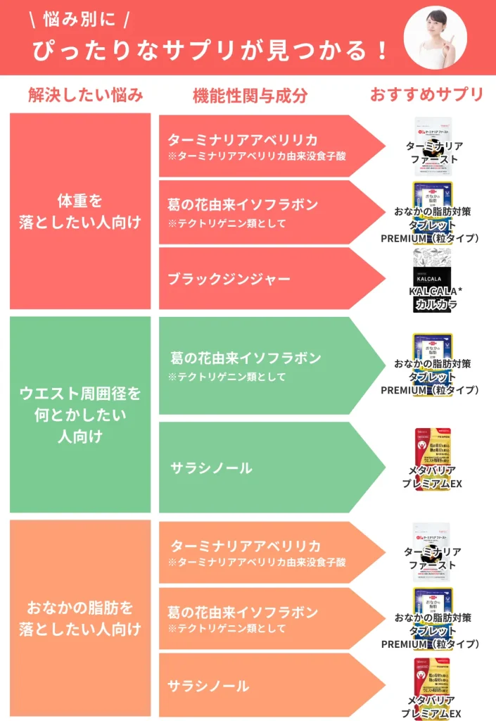 | こんな方におすすめ | おなかの脂肪を対策したい方 体重の目標がある人 ▼ | ・おなかの脂肪対策をしたい方 ・ウエスト周囲径、体重が気になる方 ▼ | ・おなかの脂肪*12を対策したい方 ・脚のむくみ*11を軽減したい方 | 糖・脂・腸内環境にアプローチしたい方 ▼ | ・ウエスト、体重、BMIが気になる方 ・健康的に痩せたい方 ▼ |