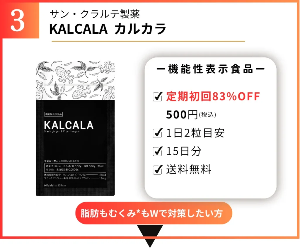 たった2粒目安で脂肪にアプローチしながら、冷えやむくみもまとめて対策できる優秀サプリ、カルカラの通常価格は2,910円(税込)。
