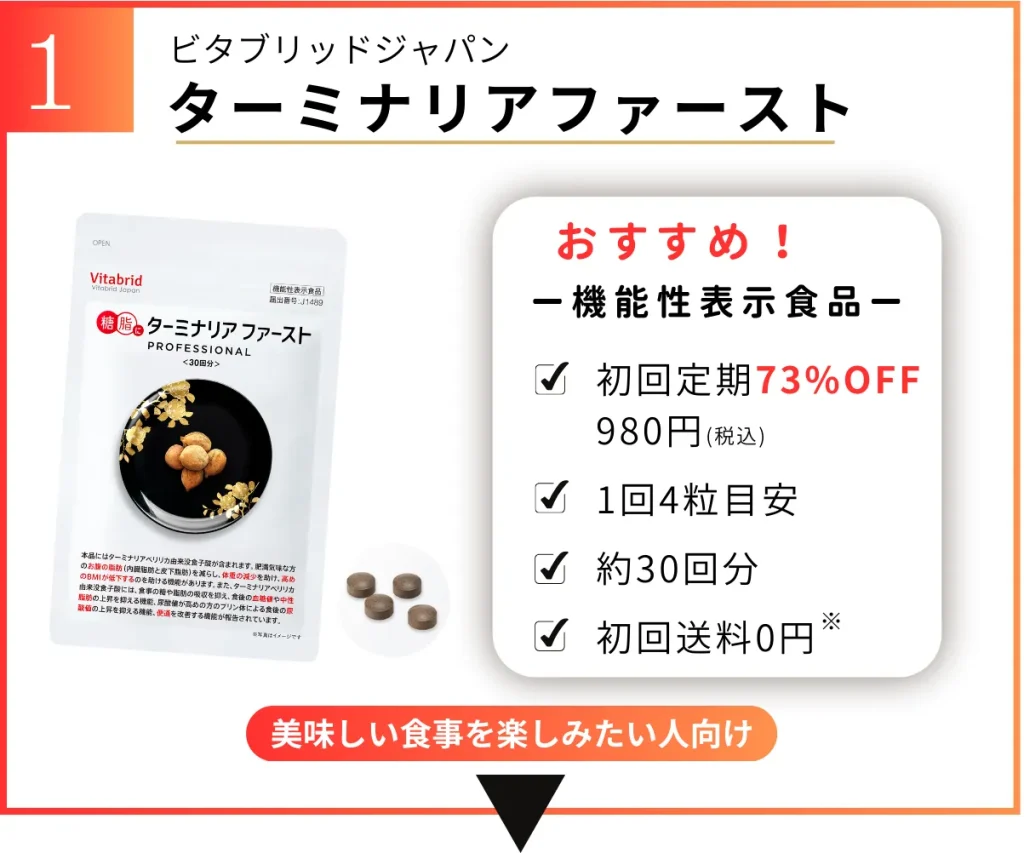 脂肪対策サプリの優秀成分として超有名な、あの「葛の花由来イソフラボン(テクトリゲニン類として)」と「ターミナリアベリリカ由来没食子酸」が配合されています!