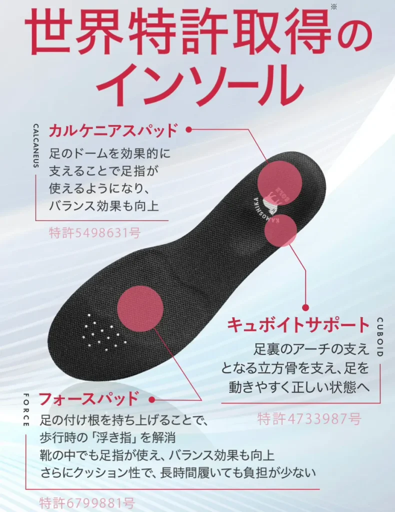 こうした効果が期待できる理由は、「カモシカソール」に採用されている世界特許の3つの技術にあります。