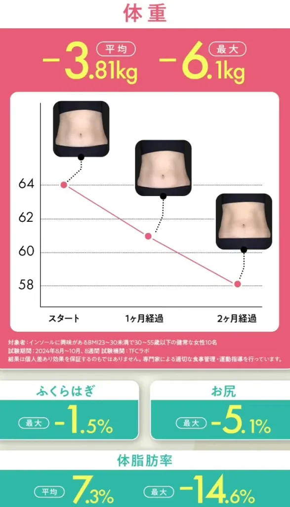 | ダイエット効果 | 体重MAX-6.1kg 体脂肪率MAX-14.6%*2 | ![]() 体重MAX-5.3kg 体脂肪MAX-1.53kg*4 | ![]() 体重MAX-5.05kg*5 体脂肪率MAX-4.3%*5 |