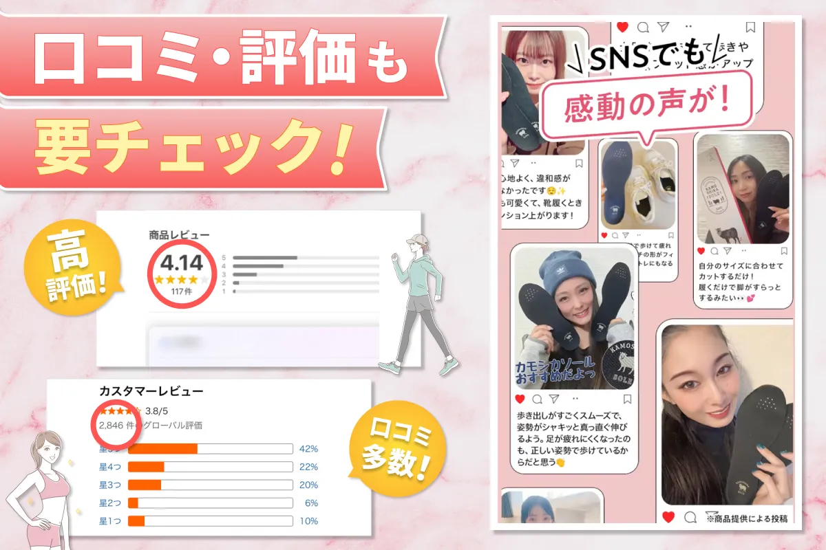 口コミでも、「普段履いているスニーカーに入れるだけで正しい姿勢に補正してくれる!」などと、人気を集めています。