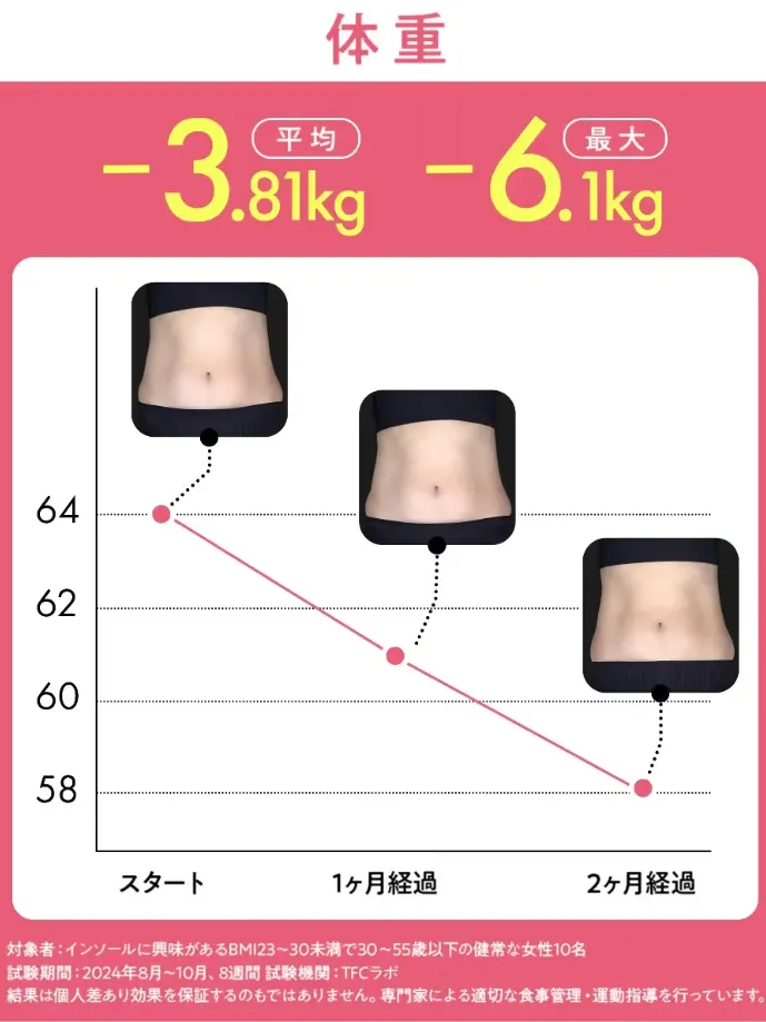 | ダイエット効果 | 2ヶ月で体重MAX-6.1kg 体脂肪率MAX-14.6%*2 | ![]() 体重MAX-5.3kg 体脂肪MAX-1.53kg*4 | ![]() 体重MAX-5.05kg 体脂肪率MAX-4.3%*5 |