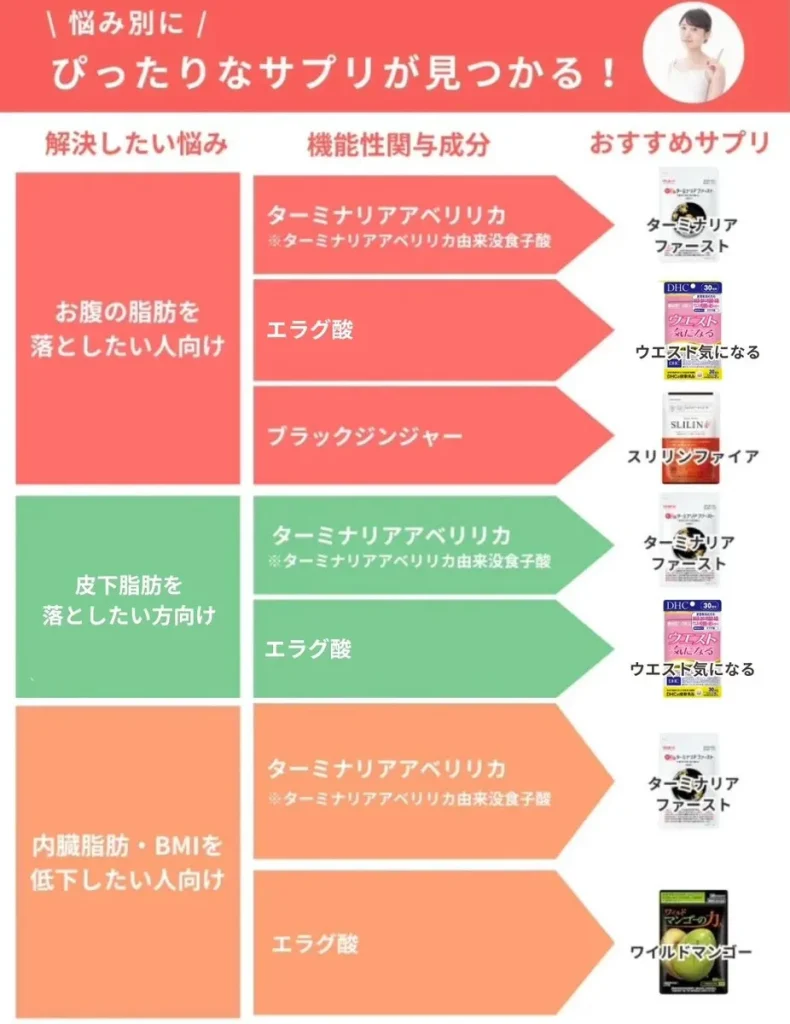 ただ、脂肪対策サプリと言っても「悩み別」に選ぶべき「機能性関与成分とサプリ」は異なるので自分にあったサプリを確認しましょう。