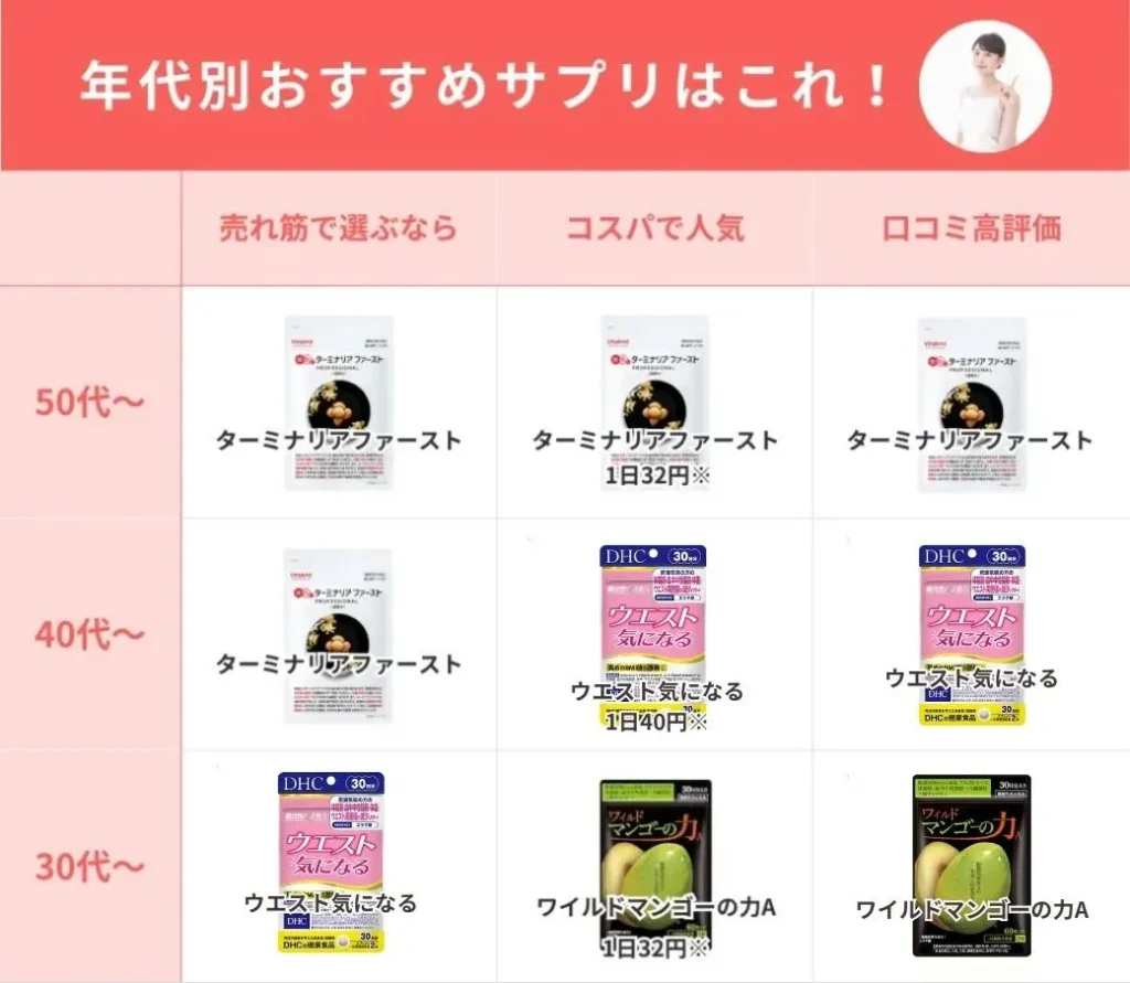 さらに、「年齢別」に選ぶべき脂肪対策サプリを「売れ筋」「コスパ」「口コミ高評価」に合わせて見ていきましょう。