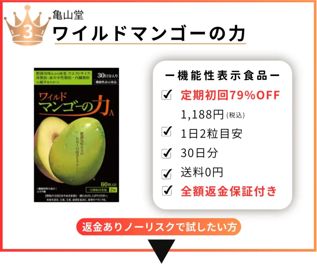 ワイルドマンゴーの力Aは、楽天ランキング6部門第1位に輝き、あの有名女性誌「MUSE」で脂肪・体重減少部門第1位を獲得するなど人気と実力を兼ねそろえたダイエットサプリです。