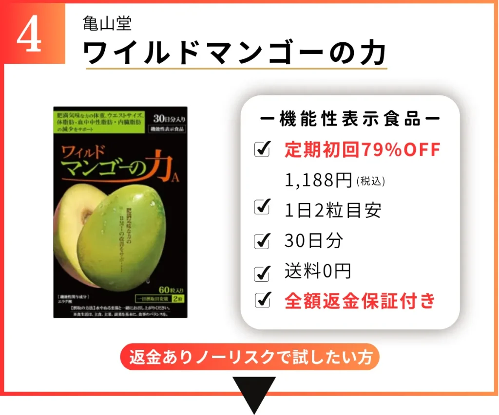 | こんな方におすすめ | おなかの脂肪を対策したい方 体重の目標がある人 ▼ | ・おなかの脂肪対策をしたい方 ・ウエスト周囲径、体重が気になる方 ▼ | ・ウエスト、体重、BMIが気になる方 ・健康的に痩せたい方 ▼ | ・全額返金保証が付いてるサプリでまずは試したい人 ・特に内臓脂肪をなんとかしたい人 ▼ | ・がんこな脂肪を落としたい方 ・代謝の低下気味の方 ▼ |