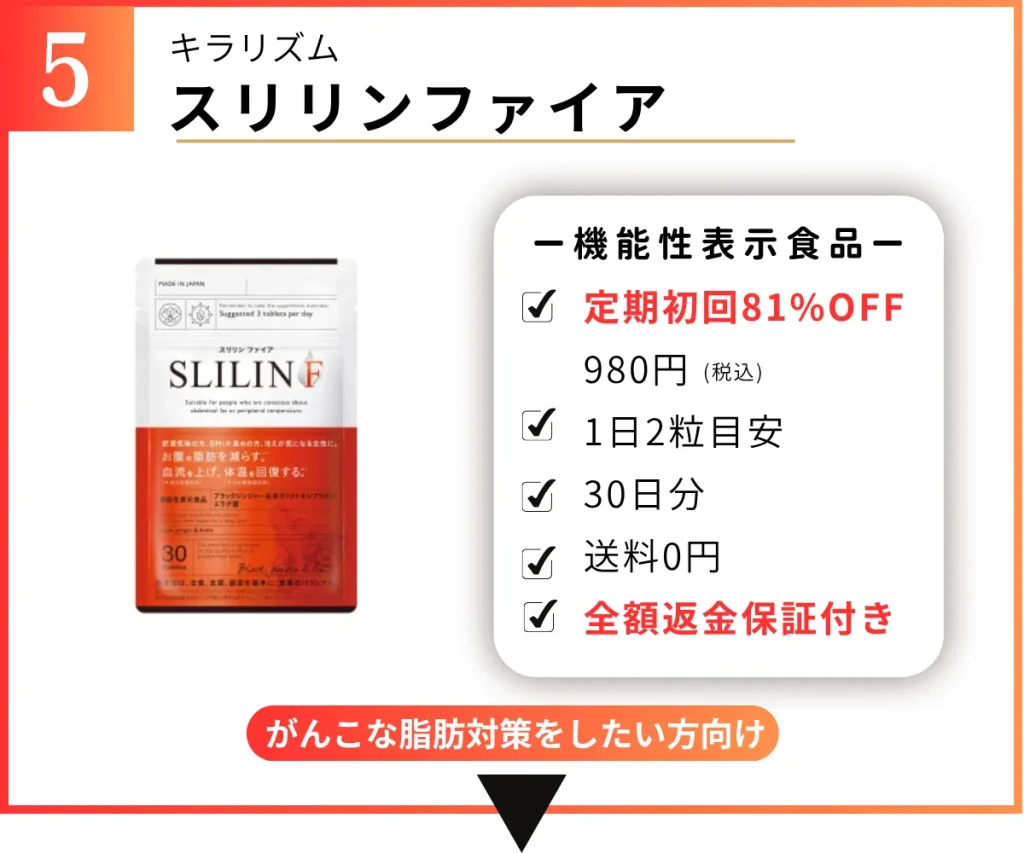 選ばれた5つの優秀なサプリは、配合成分が体重・ウエストサイズ・おなかの脂肪などを減らすのを助ける*1機能を消費者庁に報告している「機能性表示食品」のみを厳選しています。*1)※肥満気味な方の